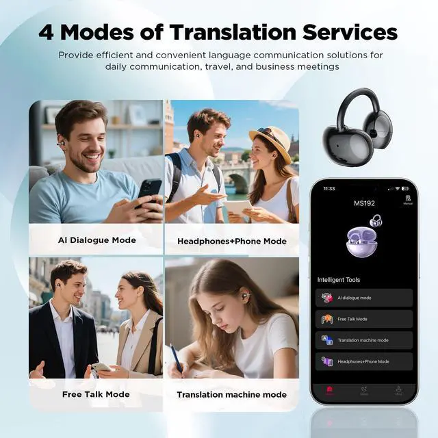 Adapt to various scene translating modes: Easily switch between four translation modes to optimize communication in various environments.The bluetooth earbudss Al dialogue mode, Free Talk mode, Translation machine mode, and Headphones+Phone mode meet the needs of various scenarios such as international travel, business meetings, and language learning.