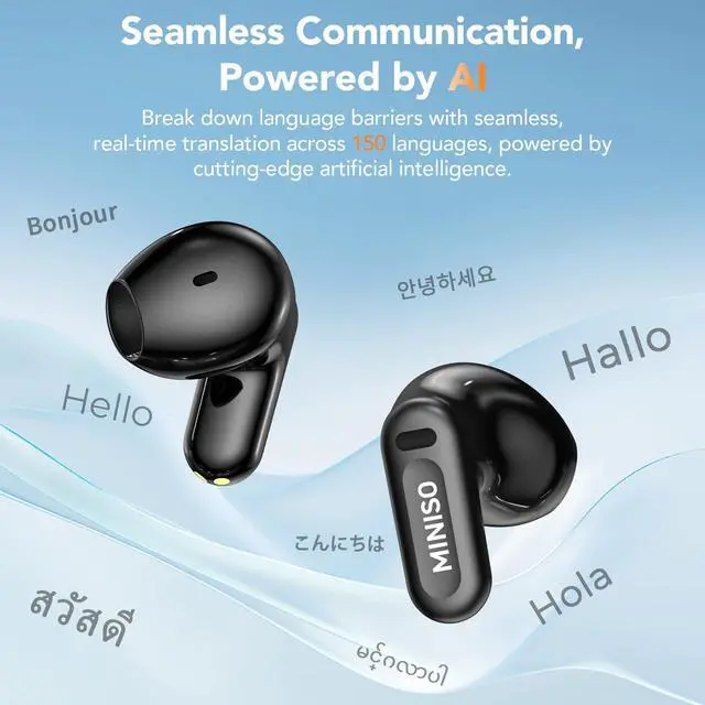 AI-Powered Real-Time TranslationThe MINISO MS109 AI translation earbuds deliver seamless real-time two-way interpretation across 150 languages. Featuring multiple translation modes, these smart translation earbuds adapt effortlessly to diverse environmentsfrom international conferences to travel and language learningenabling smooth and natural cross-cultural dialogue.