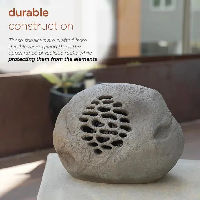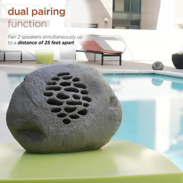 • TRUE STEREO DUAL PAIRING: Easily connect the Set of 2 rock speakers to create an immersive, wide sound field; speakers can be positioned up to 25 feet apart for ideal audio coverage across your yard or patio.