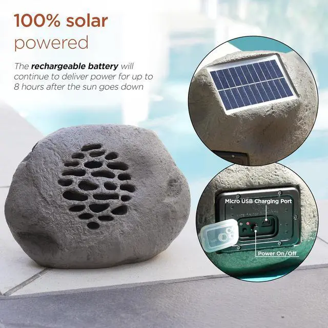 • SOLAR POWERED & CORD-FREE: Integrated solar technology charges the built-in rechargeable battery; provides up to 8 hours of continuous playtime after sunset; Micro-USB port included for optional rapid charging.