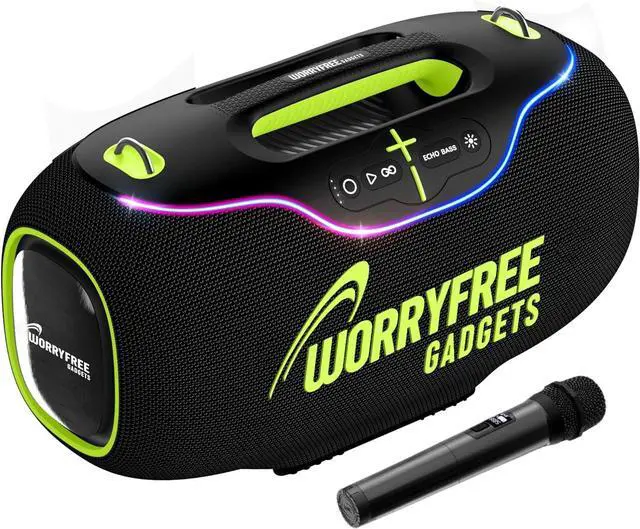 The wireless speaker offers powerful sound and deep bass, with a built-in handle and microphone for portability and versatility. It features Bluetooth connectivity, multiple input options, and a rechargeable battery for extended playtime.