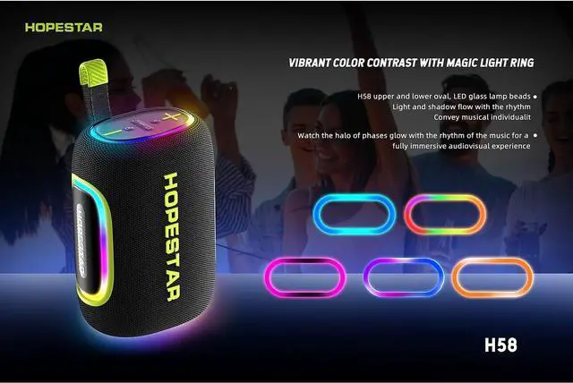 The HOPESTAR H58 speaker offers an immersive audiovisual experience with its vibrant LED light ring. The upper and lower oval-shaped LED beads pulse to the rhythm of your music. Perfect for parties, the H58 adds an element of visual flair to match its powerful sound.