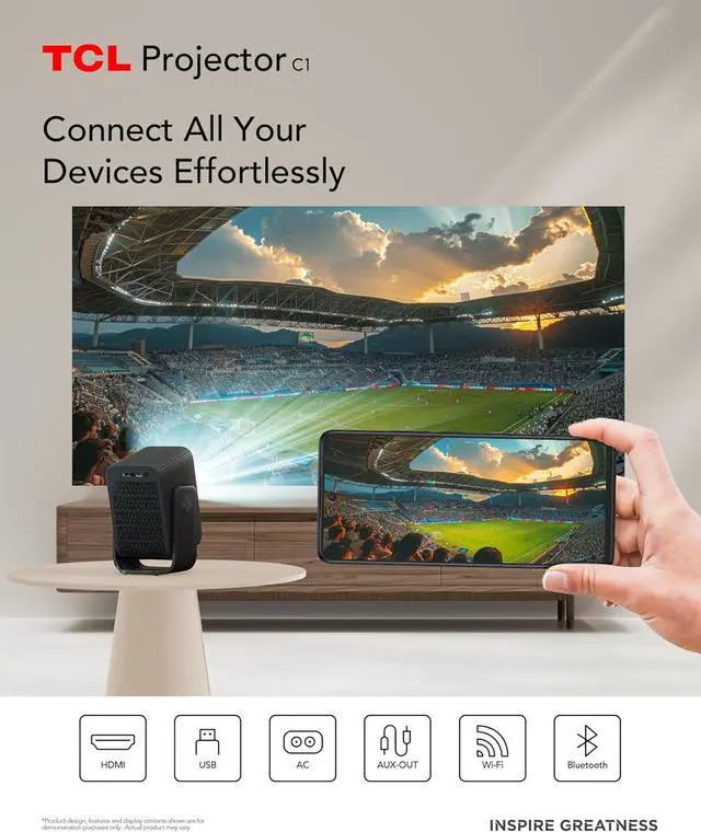 Universal Installation & Total Compatibility - The TCL C1 projector base integrates a standard 1/4-inch mount for tripod, ceiling, or wall installation, making it ideal for home cinema, gaming, office, and studio use. Equipped with HDMI 2.1, USB 2.0, and 3.5mm audio input ports, it is compatible with laptops, DVD players, gaming consoles (Switch/PS5/Xbox), external speakers, and more. Bring the cinema anywhere: bedroom, living room, gym, garden, camper, or tent.