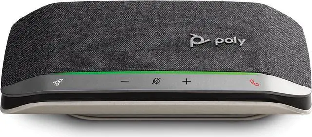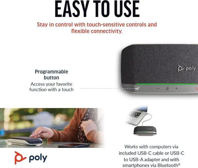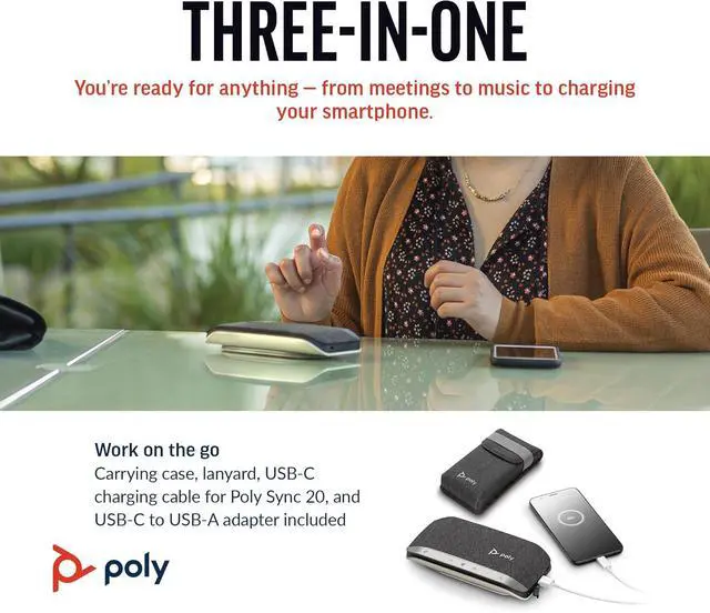 Sound like the professional you are with the Poly Sync 20 USB / Bluetooth® speakerphone for remarkable conference calls and music anywhere. With its sleek, modern design and more than 20 hours of battery life, this personal Bluetooth and USB speakerphone is IP64 dust and water-resistant and comes with its own carrying caseperfect for working on the go all day long. It can even charge your smartphone! Zoom certified and compatible with Microsoft Teams and other conferencing platforms, the Poly Sync 20 portable speakerphone for conference calls provides an array of smart features that let you hear and be heard. A three-microphone array for echo and noise reduction keeps the focus on your voice, not the background noise, while full duplex audio enables natural, simultaneous conversations without missing a word. Enjoy more clarity on every call thanks to the bass reflex system with dual passive radiators for natural voice and deep bass. More than just a portable speakerphone, the Poly Sync 20 also delivers multimedia quality sound that is a music-lovers delight. This personal Bluetooth speakerphone for computer and mobile devices lets you connect the way you want. Simply connect your smartphone or tablet wirelessly using Bluetooth or to a PC/Mac via USB-C or USB-A (via included USB-C to USB-A adapter) for a wired connection. Easy to use, the Poly Sync 20 features a programmable button that lets you quickly access your favorite functions, including play/pause music, last number redial, voice assistant, and more. The highly visible light bar lets you view the call status, even from across the room.
