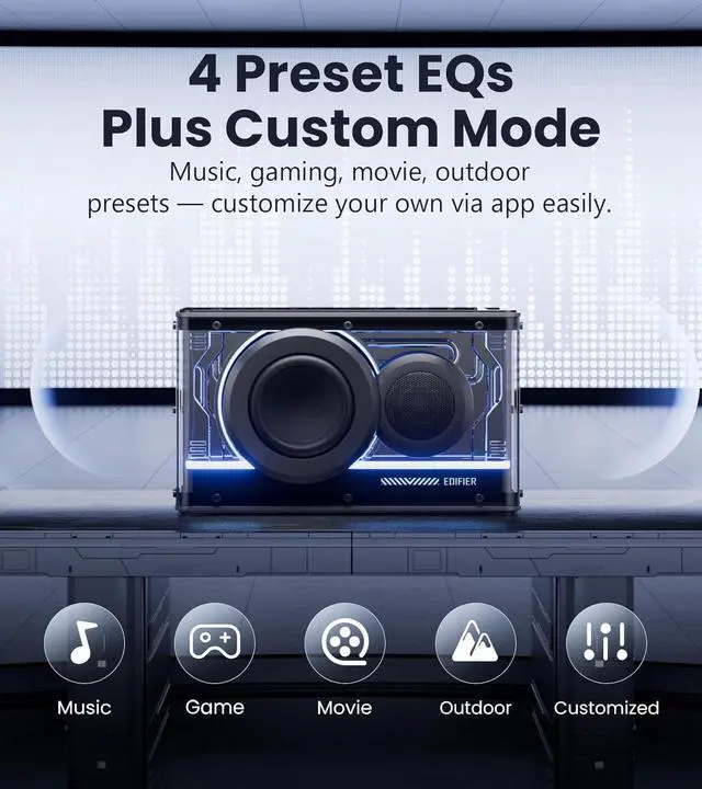4 Preset + Custom Sound ProfilesComes with 4 preset sound modes - Music, Game, Movie, and Outdoor. Game mode enhances bass and sound effects; Movie mode improves dialogue clarity. Custom EQ via EDIFIER ConneX (mobile)/TempoHub (computer) App for person