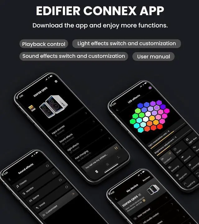 [EDIFIER ConneX App] It is compatible with EDIFIER ConneX App for additional functions, including playback control, sound effects switch and customization, light effects switch and customization.