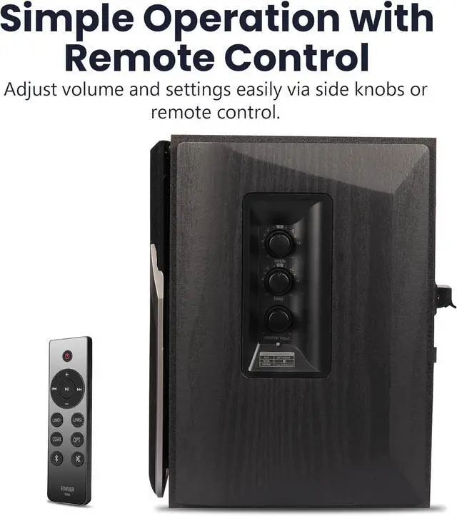 EASY CONTROL - R1380DB comes with a remote control that helps you to control from a distance. Side panel control at one of the speakers for easy operation.