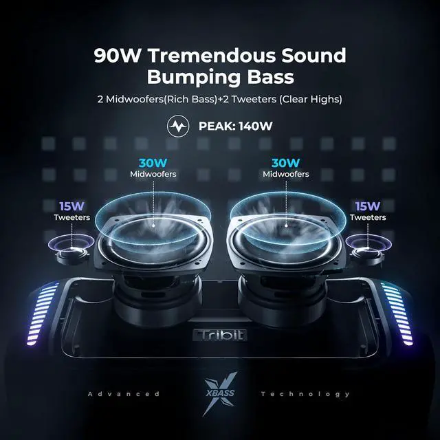 140W PEAK with Body-shaking XBass Tech: Providing a distortion-free, rich, and balanced sound, Tribit StormBox Blast is powerful 90w portable speaker you need; Press the XBass to pump the bass and feel the body-shaking experience of the StormBox Blast.