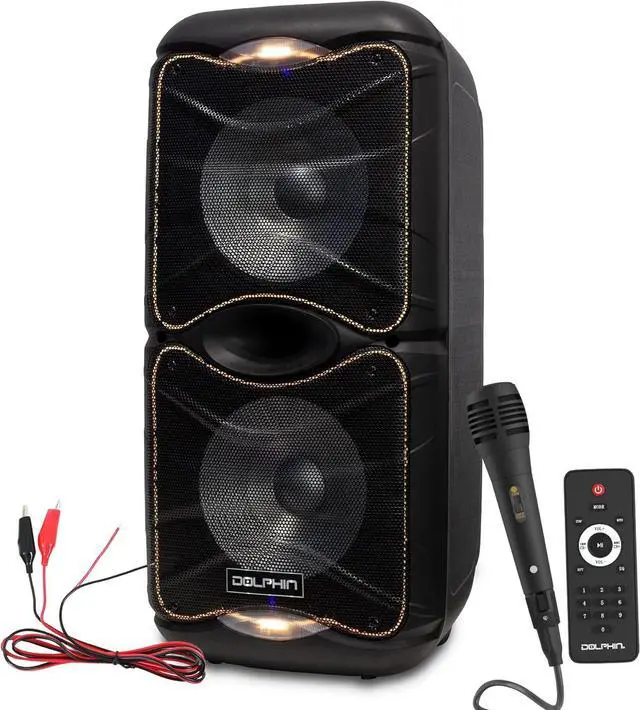 PARTY SPEAKER: Microphone jack with treble, bass and echo controls as well as a guitar jack. Sound activated 7-Color LED light flash and dance along with the beat of the music. Can be turned off as needed. Dimensions: 32" (L) x 14" (W) x 14" (H), Weight: 37.3 lbs