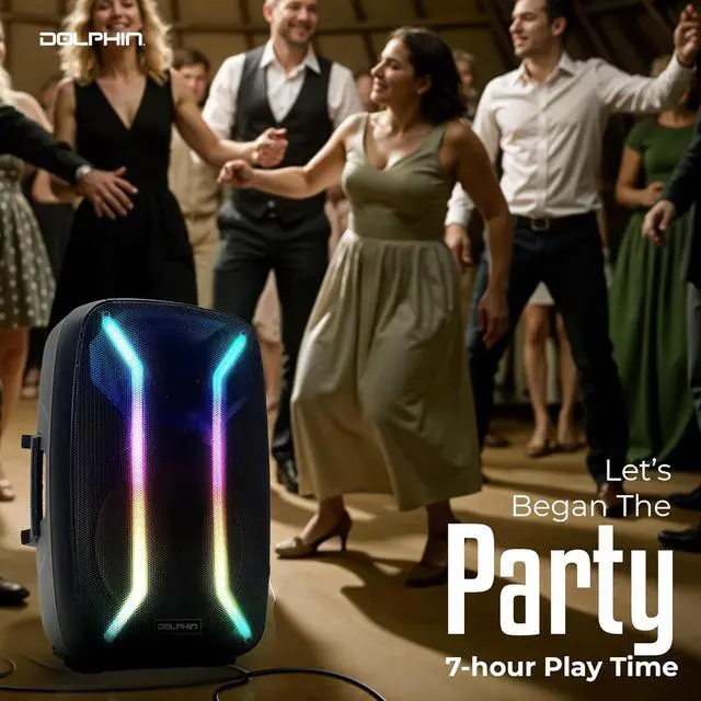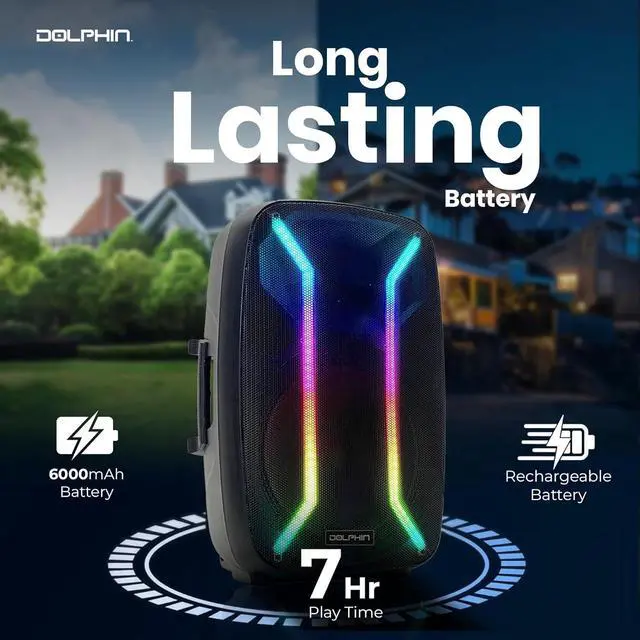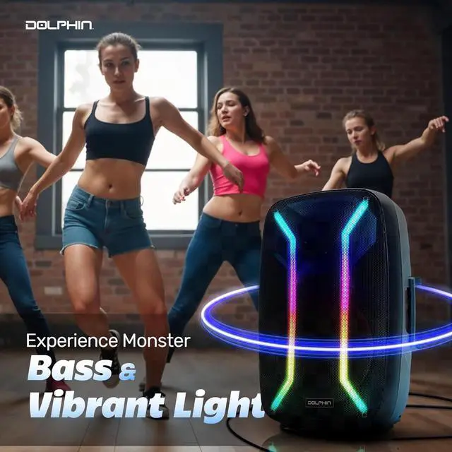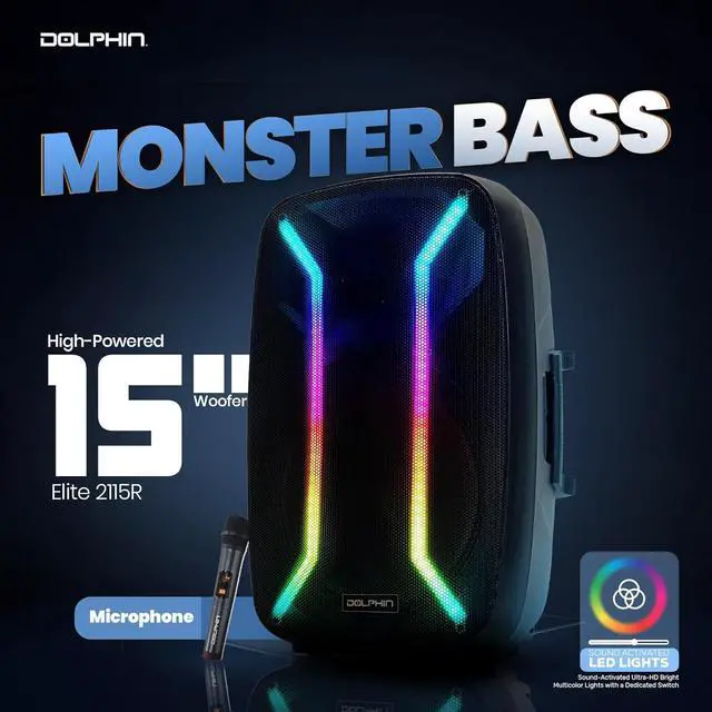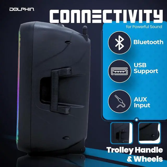 Dolphin SPX-2115R is a powerful and versatile portable Bluetooth speaker designed for professional DJs, events, and large parties. It features a rechargeable 7-hour battery, trolley handle with wheels for portability, XLR inputs and outputs, and a 15" woofer that delivers clear, loud sound with deep bass.