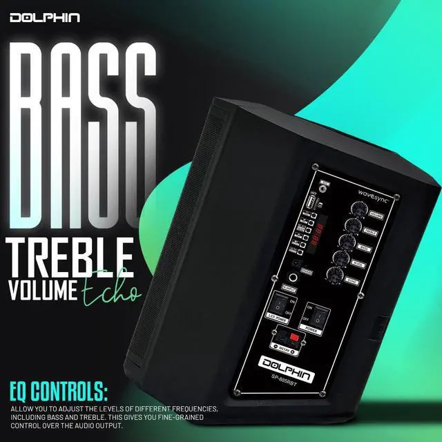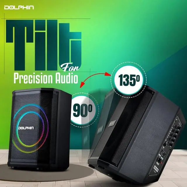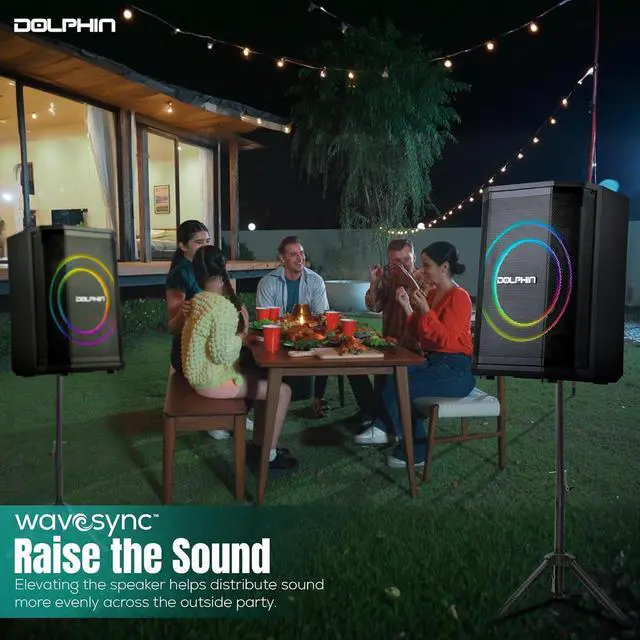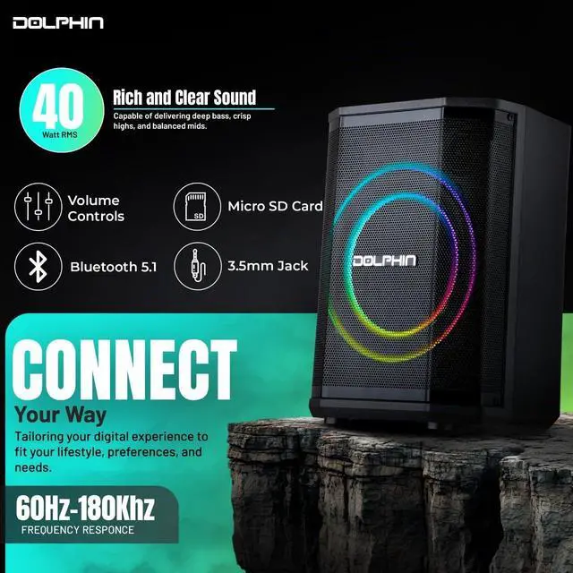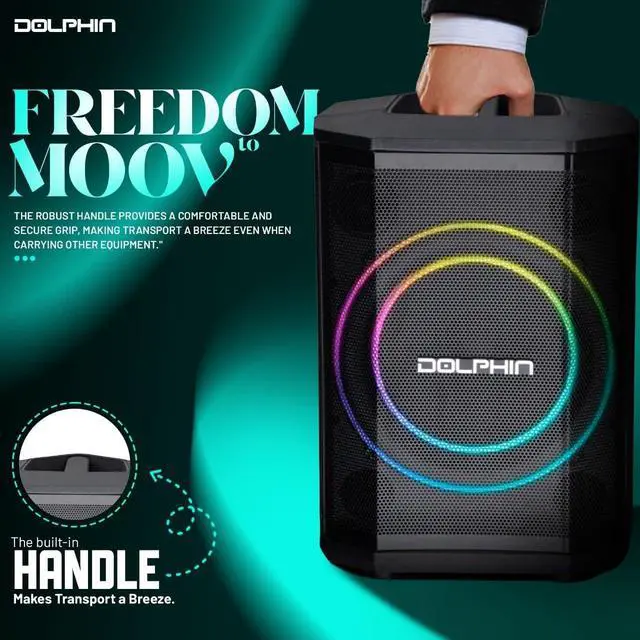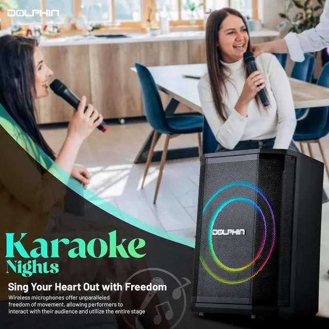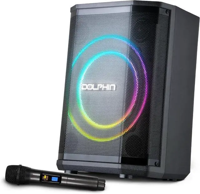 Dolphin Rechargeable Portable Bluetooth Party Speakers, 3D LED Ring Light, TWS, Wireless Microphone, and Multiple Playback Options, Easy-to-Carry, On-The-go, PA System, Karaoke-Ready