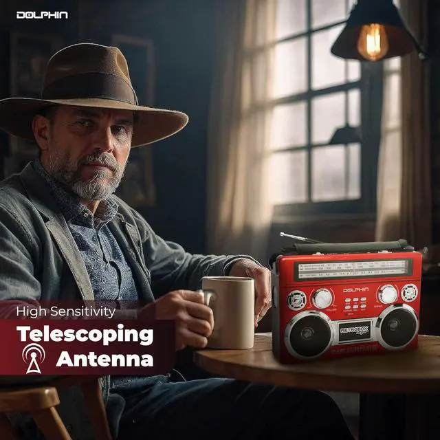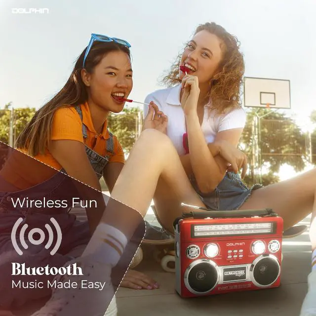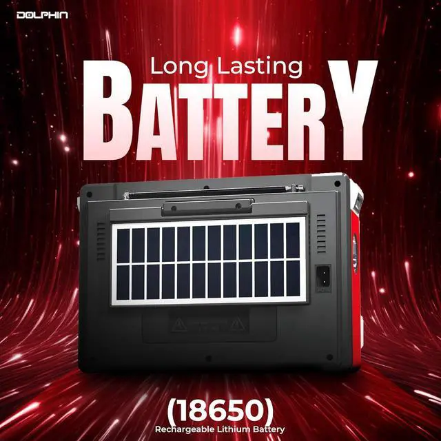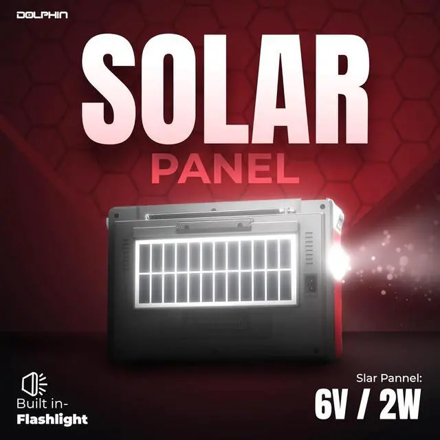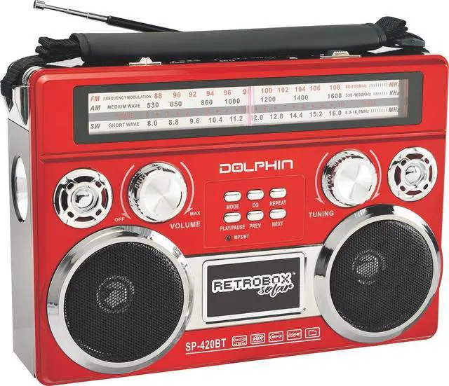 Introducing the Dolphin SP-420BT Solar Rechargeable RETROBOX Portable Bluetooth Radio, the perfect fusion of retro charm and modern convenience. Designed for adventure and everyday use, this portable radio offers versatile features like Bluetooth streaming, MP3 playback, and AM/FM/SW radio bands. Its solar panel ensures youre always powered up, whether you're camping, enjoying a beach day, or braving a power outage. Compact and easy to carry, its your go-to device for big sound, anywhere.