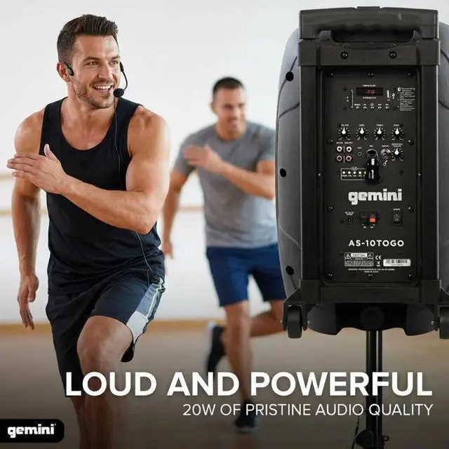 PORTABLE PA SPEAKER WITH WHEELS 20W, NO OUTLET NEEDED Battery powered PA speaker with retractable trolley handle and wheels. Roll it to the backyard, beach, tailgate, or block party 20W peak Class D power, no extension cord required. Charge it and go.