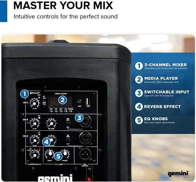 • PA SYSTEM WITH MIXER - Complete line array speaker system solution featuring built-in 3-channel mixer with gain controls, dual XLR/¼"combo inputs for mics/instruments, adjustable reverb effect, master EQ controls, plus Bluetooth streaming with TWS linking for expanded coverage