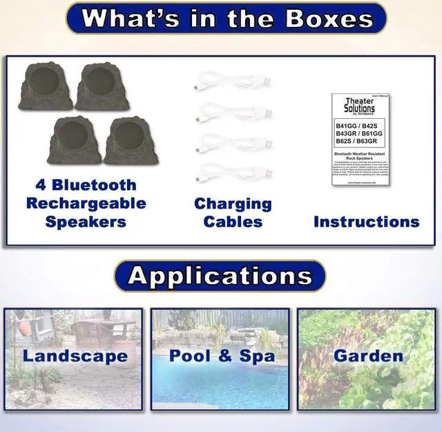 Product Description Theater Solutions by Goldwood B43GR Fully Wireless Powered Bluetooth Rock 4 Speaker Set240 Watts of fully wireless rechargeable battery power with Absolutely NO WIRES!Newest Bluetooth Technology lets you pair to the first speaker and wirelessly link up to 99 more B43GR speakersSimply pair your phone to the first speaker and link as many speakers as you want with the touch of a buttonDurable and Weatherproof against rain, snow, salt, ice, pool chemicals and moreSpeakers have Deluxe 4 inch Polypropylene woofers with Butyl Rubber surroundsWoofers are angled 20 degrees upward to direct sound to listeners60 Watts total system power per speakerSealed re-chargeable battery play time is 6 hours at standard volume and charges in 7 hoursFrequency response is 40Hz-20 kHz with 88dB sensitivity at 8ohmThe Slate Grey cabinets are multi-layer composite and silicone sealed with rust resistant steel grillsPowered Bluetooth rock speakers are (H x W x D) 8.86" × 9.45" × 7.87" eachSystem RequirementsAny Bluetooth audio streaming deviceStandard US 110V Grounded Wall Plug for chargingApplicationsBack Yard Décor and EntertainmentPatios or DecksPool and Garden AreasSpa SettingsBusiness / Office Outdoor DécorWhat's in the boxes4 Battery Powered Bluetooth Rock SpeakersDC to USB Battery Charge CablesInstruction Manual