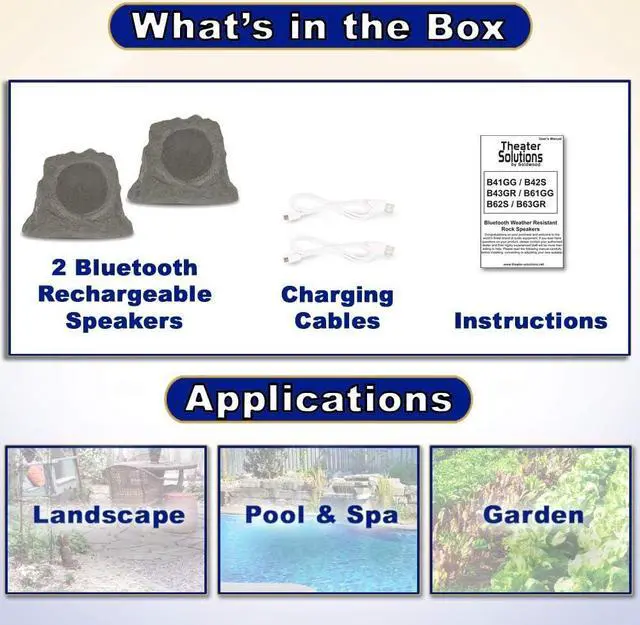 WHAT'S IN THE BOX - 2 Theater Solutions by Goldwood B63GR powered Bluetooth rock speakers, DC to USB battery charge cables, instruction manual