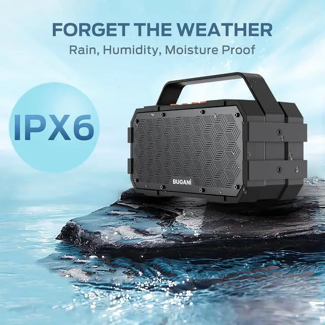 IPX6 Waterproof Protection & Fall Prevention Design With IPX6 waterproof, the Bugani party speaker can resist water splash, spray, and rain, just take it outdoors anywhere, it accompanies you on adventures, and sing and dance together. This wireless speaker is durable and shockproof enough to withstand a few bumps and bruises along the way thanks to its front and back metal grills, Ideal for travel, camping, and outdoor adventures.