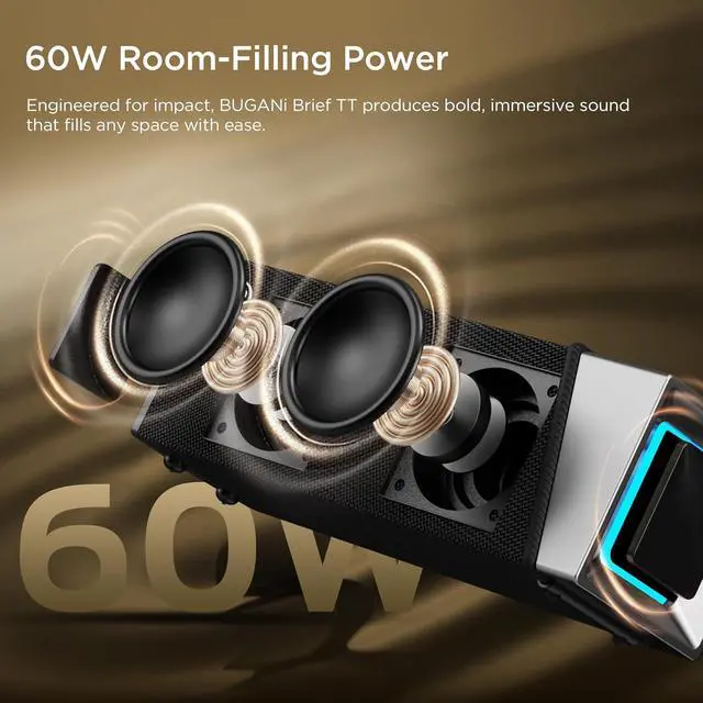 60W Power That Fills Every CornerExperience bold, room-filling sound from a compact body. With dual drivers BUGANi Brief TT portable speaker delivers deep bass, rich mids, and clear highsperfect for both indoor vibes and outdoor adventures.