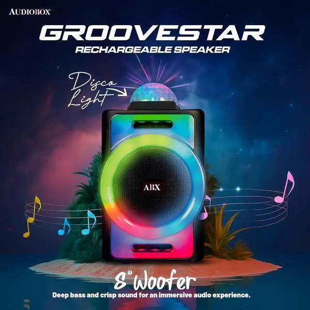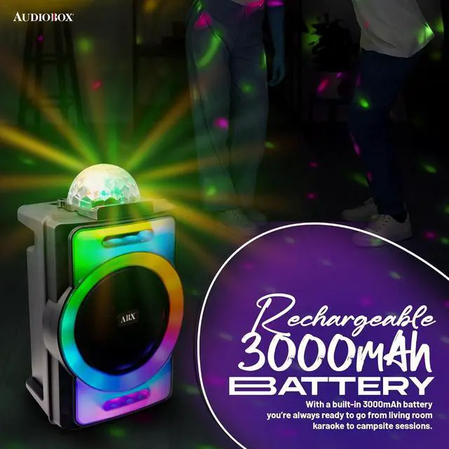 Rechargeable & Portable 3000mAh battery and carry handle let you take the party anywhere.