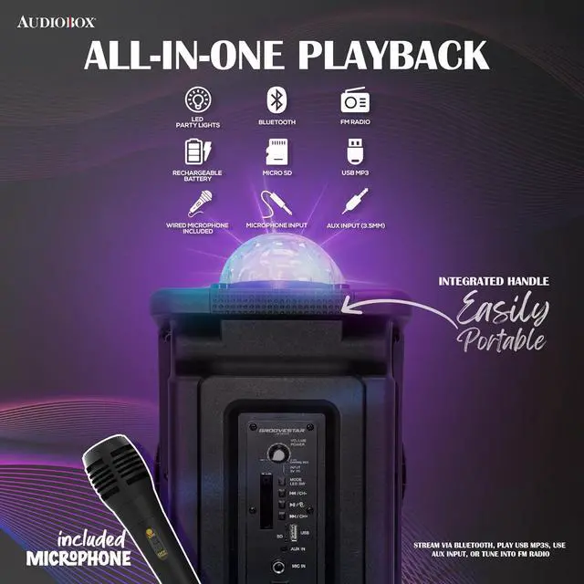 Karaoke-Ready Includes a wired microphone for sing-alongs, events, and announcements.