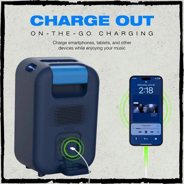 Long-Lasting Battery & USB Charge Out: With up to 12 hours of battery life, the Stomp wireless Bluetooth speaker keeps the party going all night long and wont end the party with an awkward silence. It also has USB-C & USB-A charging output so that your mobile devices can always stay charged.
