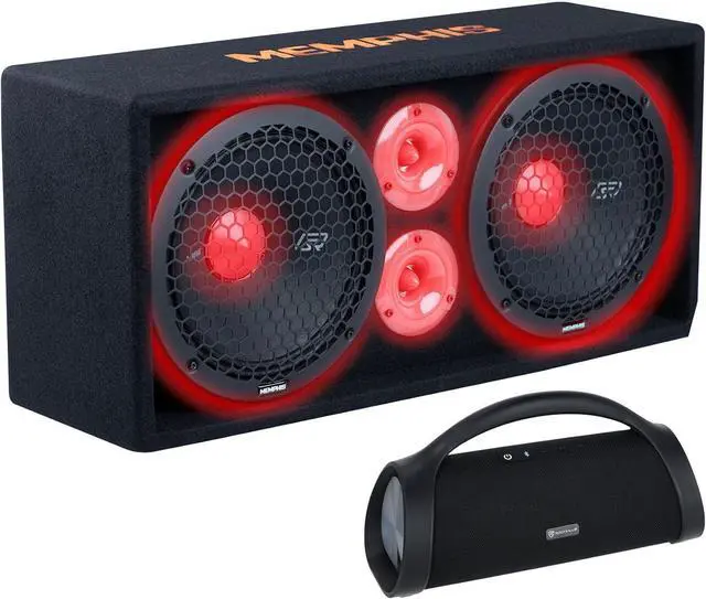 Package Includes: (1) Memphis Audio SRXPE10D4F SRX Pro Dual 10" Chuchero Car Enclosure w/Tweeters+LED. (1) Rockville SONIC-XXL Huge Portable Bluetooth Speaker with Insane Deep Bass + IPX5