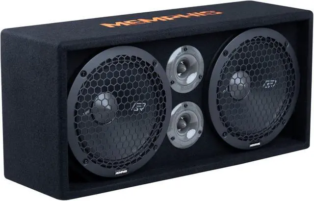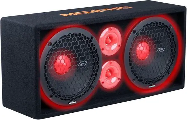 Features of SRXPE10D4F: Memphis Audio SRXPE10D4F SRX Pro Dual 10" Chuchero Car Enclosure w/Tweeters+LED. MEMFUEGO DUAL 10" & DUAL TWEETER ENCLOSURE. 10" high output SR Pro Component Speaker. Fiberglass filled paper cone with cloth edge. RGB dustcap and backlit speaker ring. 55Oz magnet. 25mm high output horn tweeter. PEI diaphragm tweeter. Mylar capacitor tweeter (6dB crossover). RGB backlit horn tweeter. Street Reference Pro Speakers. Dual 10" 2 Way Full Range Loaded Enclosure