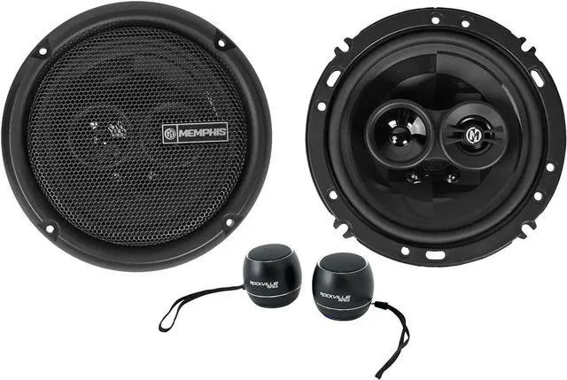 Package Includes: (1) Pair Memphis Audio PRX603 6.5" 100w 3-Way Car Speakers w/PEI Dome Pivot Tweeters. (1) Pair Rockville RPB3-BLACK Handheld Wireless Linking Portable Bluetooth Speakers.
