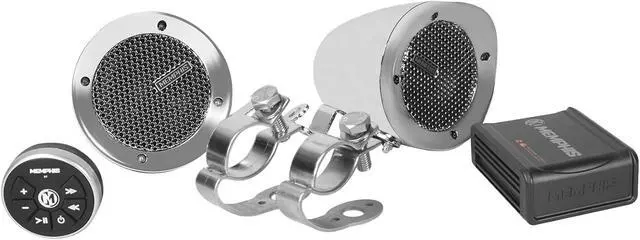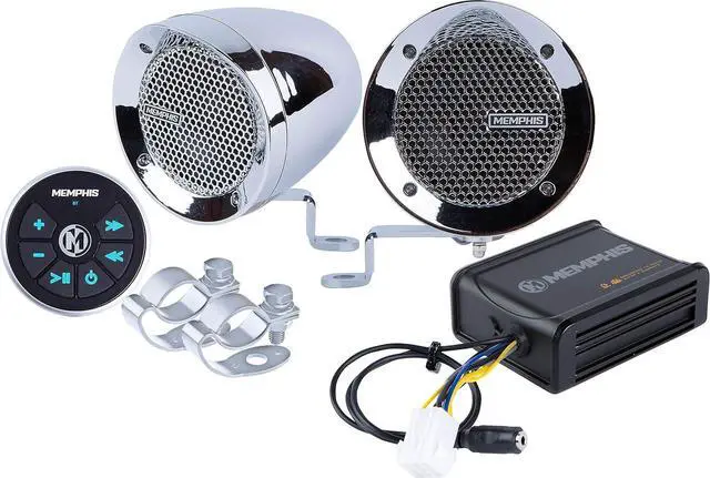 Features of MXABMC2BT: Memphis MXABMC2BT (2) Speakers+Amp+Bluetooth Control For Motorcycle/ATV/Scooter, 2 Chrome Bullet Style Powersports Speaker Kit With Bluetooth, 2-Channel 50 Watt Memphis Amplifier, 2 bullet-style speakers, MXABTR Bluetooth controller included, 2 Clamp style bar mounts, 2 Post mounts, Water resistant wiring harness