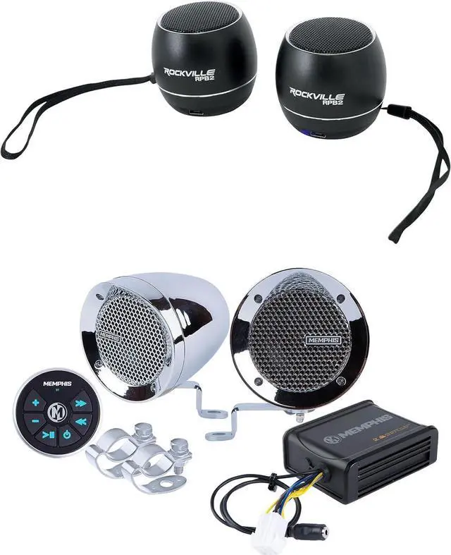 Package Includes: (1) Memphis MXABMC2BT (2) Speakers+Amp+Bluetooth Control For Motorcycle/ATV/Scooter, (1) Pair Rockville RPB3-BLACK Handheld Wireless Linking Portable Bluetooth Speakers