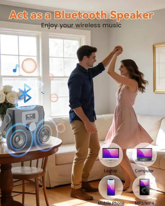 Two power supply methods:Insert the USB receiver into the energizing port and plug the other end into the power port; portable radio has a built-in 2000mAh large-capacity battery (no additional purchase required). When you need to go out, after it is fully charged, you can take it with you and continue to enjoy your happiness time. With a 3.5mm headphone jack, you can enjoy privacy through your headphones without disturbing others around you