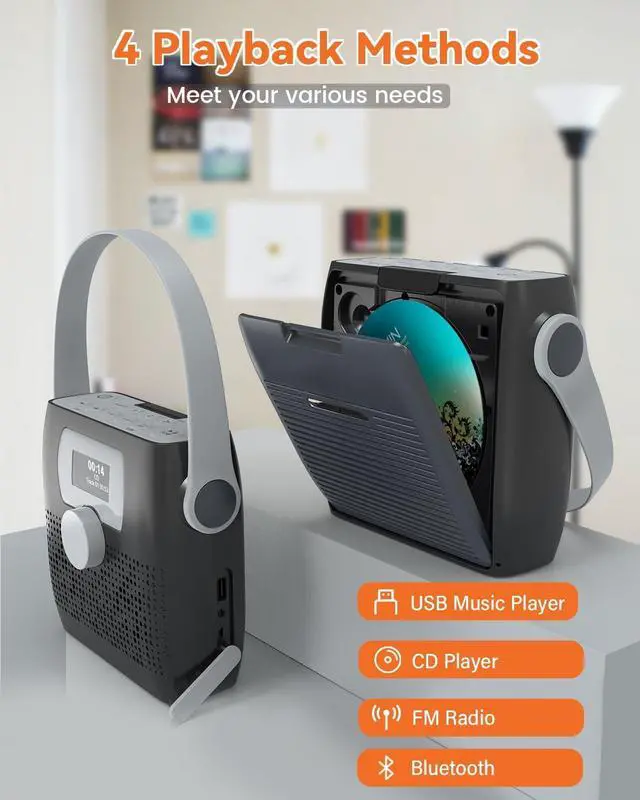 CD player and FM radio:As a portable CD player: Compatible with CD-DA/CD-R/CD-RW/MP3/WMA, with random play, repeat play and programming functions. As an FM radio: built-in FM tuner, 3 FM preset stations, equipped with long antenna and upgraded DSP chip, with good reception ability, you can easily receive your favorite broadcast channels whether indoors or outdoors, with 1.2.3 buttons can quickly select your favorite radio station