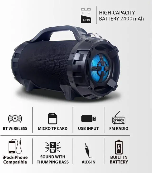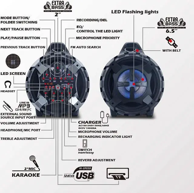 HIGH PERFORMANCE SPEAKERUnbelievable sound: 6.5" Woofer of pure audio power with enhanced bass. An advanced digital signal processor ensures pounding bass and zero distortion at any volume with flashing party lights is sure to upcharge your mood.