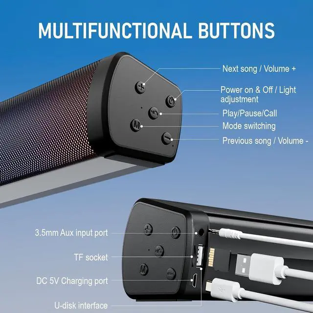 1. Experience immersive audio like never before with the Wireless Sound Bar, delivering crystal-clear dialogue and deep bass for an unparalleled entertainment experience. 2. Stream music wirelessly from your smartphone or tablet via Bluetooth. 3. Enhance your living space with the sleek and modern design of the Sound Bar, featuring a slim profile and minimalist aesthetic that complements any home decor. 4. Get up and running in minutes with plug-and-play installation and a user-friendly interface. 5. The integrated LED lights dance to the rhythm of your music, creating a mesmerizing light show that enhances your listening experience. Whether you're hosting a party, relaxing at home, or enjoying outdoor adventures, this sound bar sets the perfect mood for any occasion.