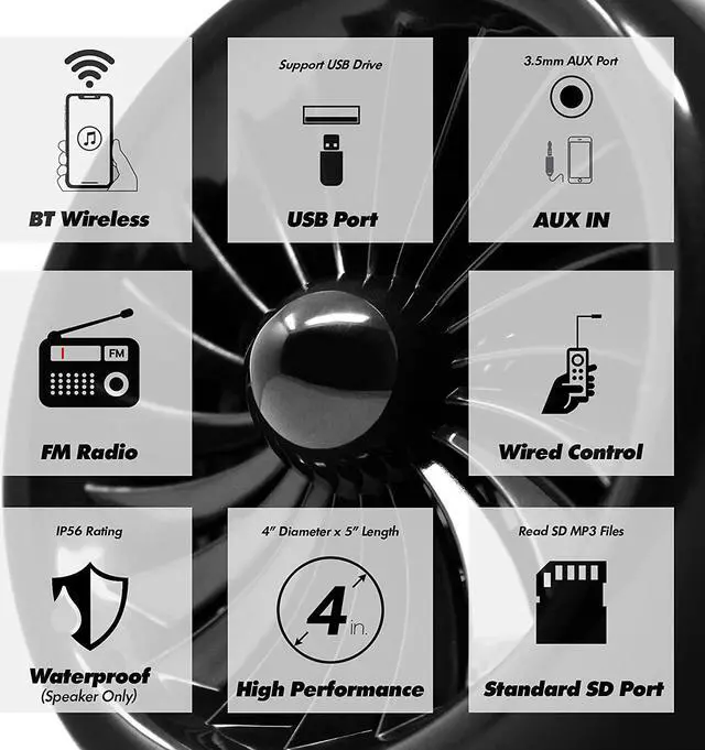 FunctionsBluetooth, FM Radio, USB, SD, AUX-inControlsWiredAmplifierClass-ABNo. of Speakers4Speaker Dimension4 W x 5 L(in.) / 101.6 x 127(mm)MaterialAluminum Alloy & ABSRated Power4*25WPeak Power1000WInput VoltageDC 12VNo. of Channels 4.0USB / SDSupport USB & SD Drive in MP3 Format USB ChargingNoSignal-To-Noise Ratio>80dBResponse Range20Hz-20KHzSpeaker Core Size4" Full-RangeAntenna ConnectorSMA TJ4-Q Black