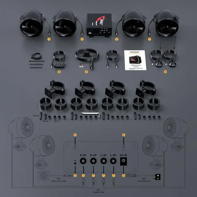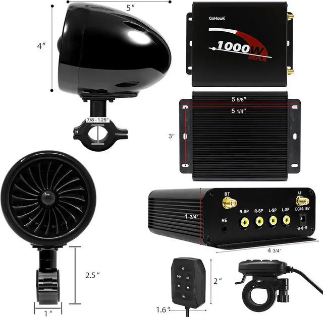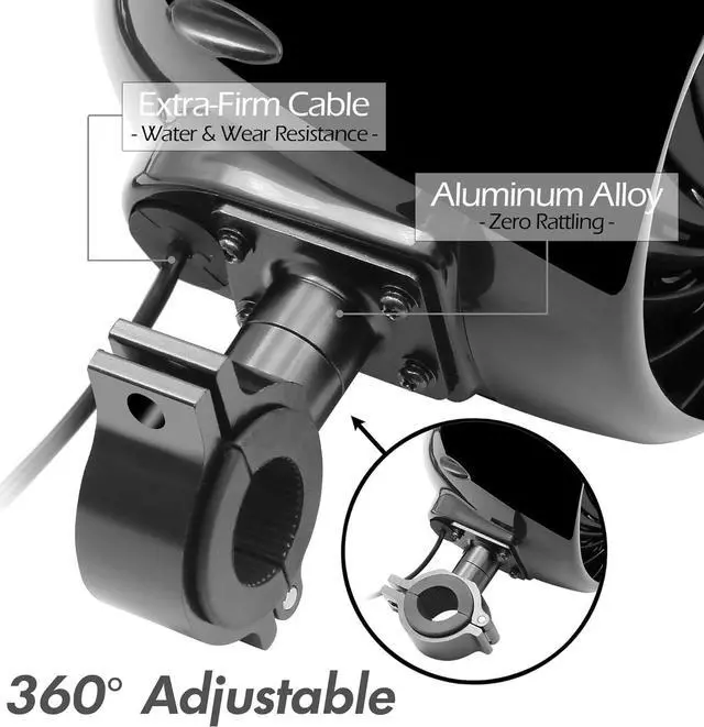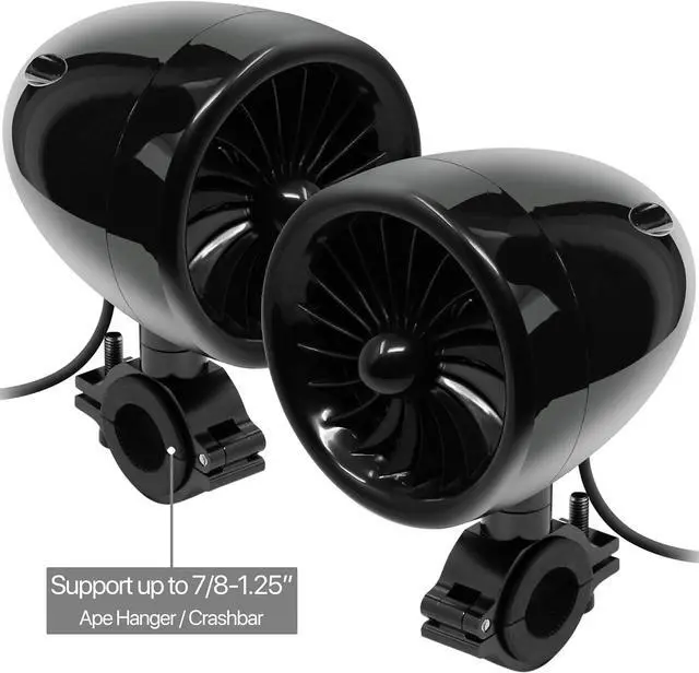Rubber inserts fit 7/81-1/4 handlebars. Adjustable clamps optimize speaker angles for perfect sound projection.