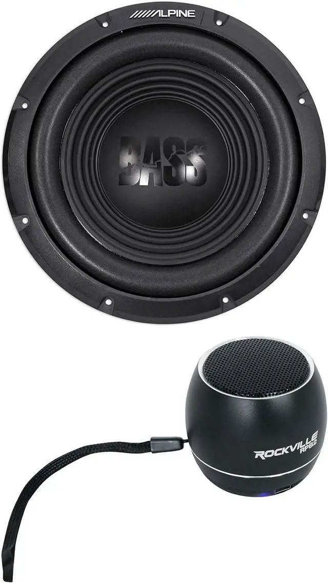 Drecription of W12S4: Alpine W12S4 12" 750 Watt Peak 250 Watt RMS 4-Ohm Car Audio Subwoofer Sub Description of RPB2-BLACK: Rockville RPB2-BLACK Handheld Wireless Portable Bluetooth Speaker Great Sound