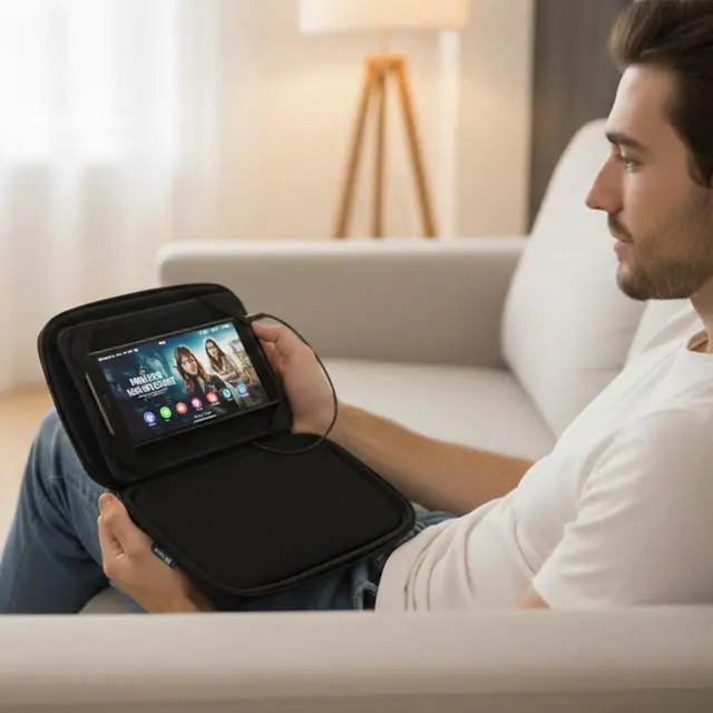 Product DescriptionThe Tablet Speaker Case with Rechargeable Battery combines device protection with improved sound performance in one convenient solution. Designed to fit tablets and smartphones up to 7 inches, this portable pouch features a built-in stereo speaker that enhances audio clarity for everyday use.