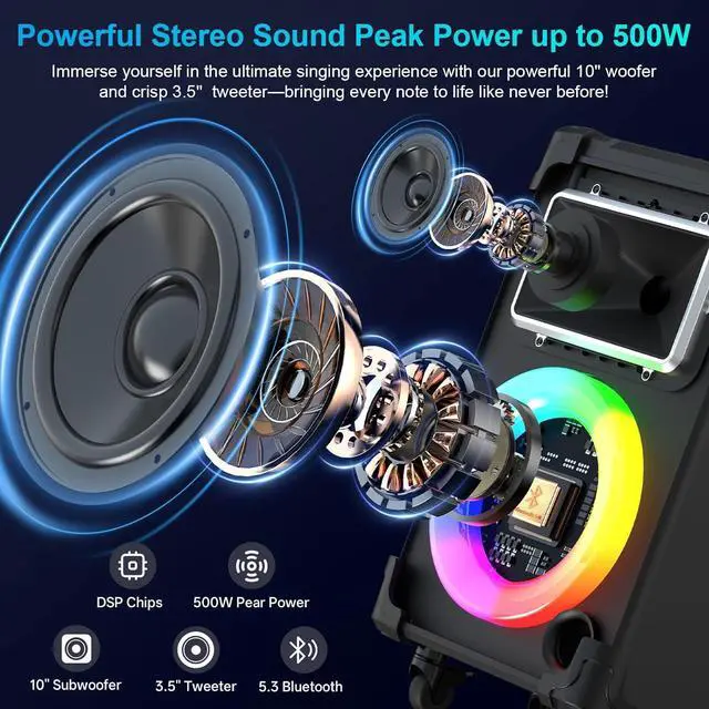 • HD Stereo Sound QualityThe karaoke machine for adults has built-in a 10" woofer, 3.5" tweeter and a peak power of up to 500w for full range surround stereo sound reproduction. Independent Reverb/Treble/Bass adjustment makes music loud,clear and strong. It will bring you the perfect sound quality enjoyment for your karaoke party and family gathering.