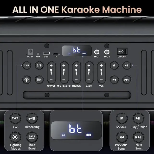 Dual Wireless Microphones & Karaoke FunIncludes two UHF wireless microphones with stable signal transmission, perfect for karaoke parties, speeches, and family gatherings. The Bluetooth recording function allows you to capture and relive your singing performances with ease.