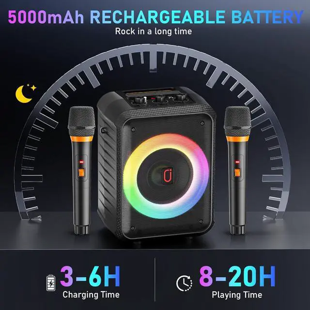 Party that Doesnt PauseThe built-in 5000mAh battery lasts about 820 hrs (volume/lights affect time) and supports play-while-chargingso backyard BBQs, camping nights, school fairs, and Sunday services keep rolling even when the battery runs low.