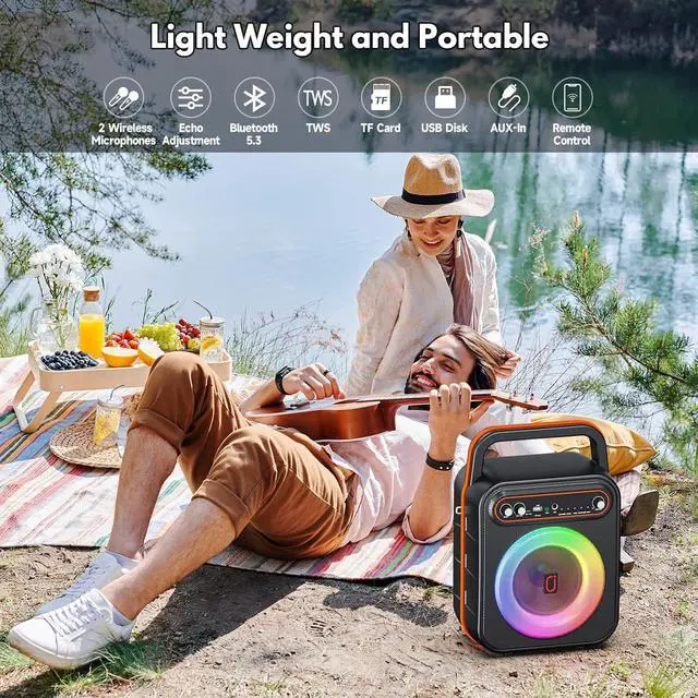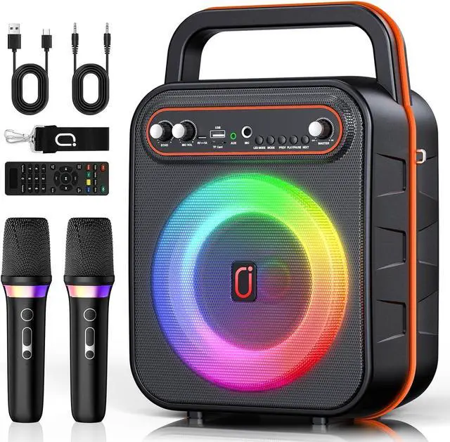 Portable Karaoke machine: Include two wireless microphones for your home karaoke. It is easy to connect with Bluetooth, AUX, TF, USB. Two microphone set so you can share each other's songs with friends.Besides, the amazing karaoke speaker are 100% portable with the strap,it is suitable for people of all ages to carry. So you can karaoking anywhere, and rock out in front of all your fans everywhere.