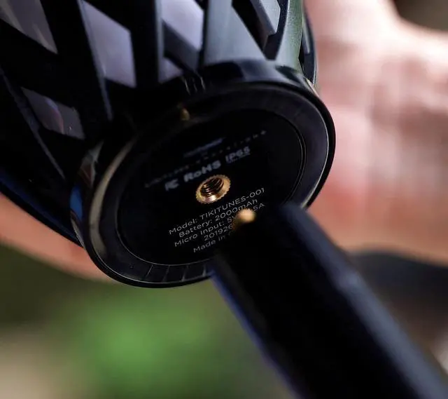 ADJUSTABLE 4FT POLE & GROUND STAKE The threaded inserts on the bottom of each TikiTunes are compatible with various mounting accessories, such as the included 4ft Adjustable Pole & Ground Stakes. Each pole comes with five 8 sections to reach a height between 8-40 tall. Thread specification is: ¼-20.