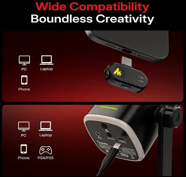 Wireless & USB ConnectionDual Mode Freedom :Plug and play with both USB wired and 2.4G wireless modes,work well on your computer, mobile phone, laptop, and even PS5. One mic, two ways to connect, meeting the needs of different scenarios. Whether it's game chatting, live streaming, podcast recording, or online meetings, this computer dual-mode USB/wireless microphone ensures you always enjoy a smooth, clean, and high-quality audio experience.