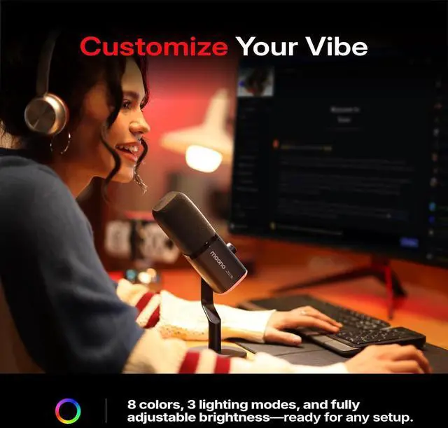 Customizable RGB, Light Up Your Vibe: This brilliant rgb gaming mic features with multi colors and 3 lighting modes. Turn on RGB lighting with a single click and effortlessly switch between 8 dynamic colors or turn it off anytime. Personalize your desk setup with adjustable brightness and color customization via Maono Link to match your space and mood while gaming or streaming. Say goodbye to harsh rainbow strips enjoy soft, stylish illumination that shines only when you want it.
