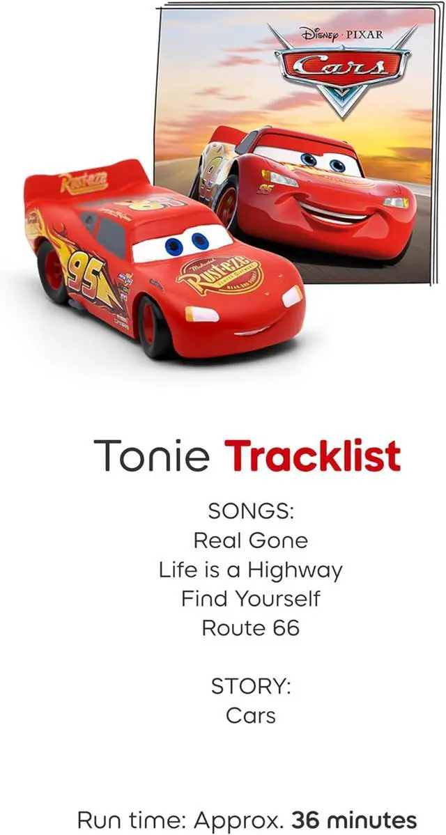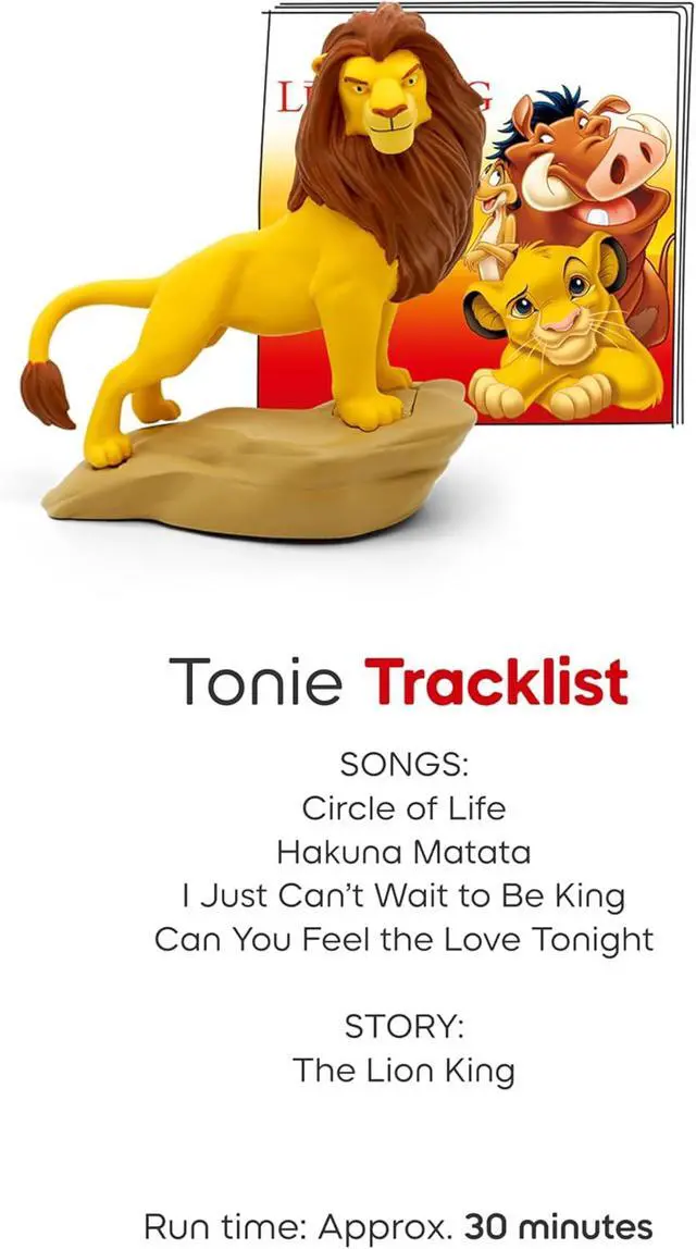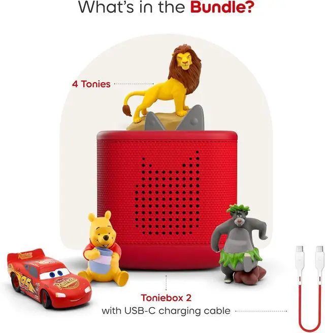 Bundle includes a Sunset Red Toniebox 2, 8.6 [22cm] USB-C charging cable, and Lightning McQueen, Simba, Winnie the Pooh, and Baloo Tonie Figurines. Power Adapter, longer charger cable, and additional Tonies sold separately. Wi-Fi needed for initial set-up. The USB-C Charging Cable is 8.6" to meet child safety standards for little listeners aged 1+.