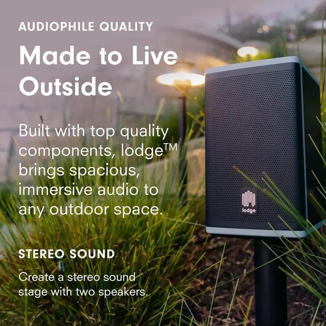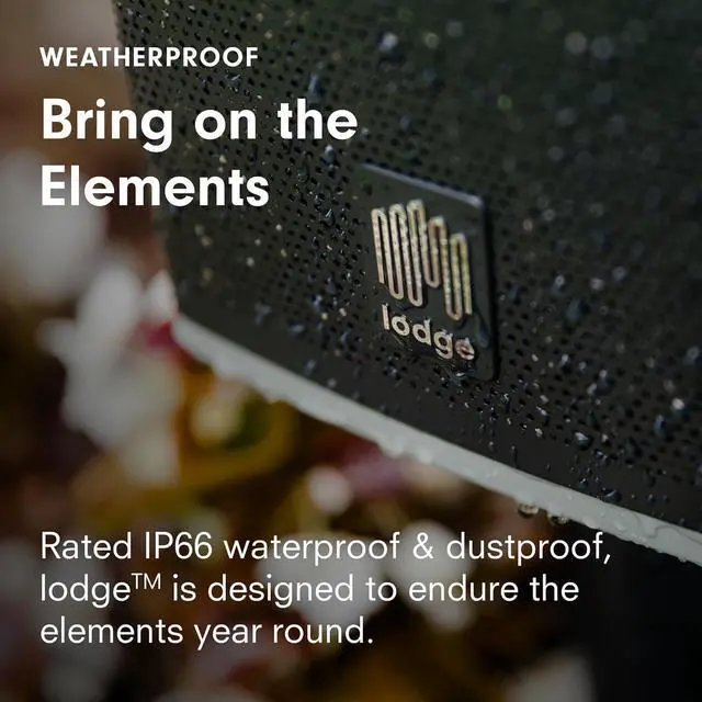 SOLAR POWERED LANDSCAPE SPEAKER - lodge is the first self-charging, weatherproof, premium wireless speaker for the outdoors. Whether youre sitting poolside, hosting a party, or relaxing in your backyard, enjoy quality soundpowered by the sun.