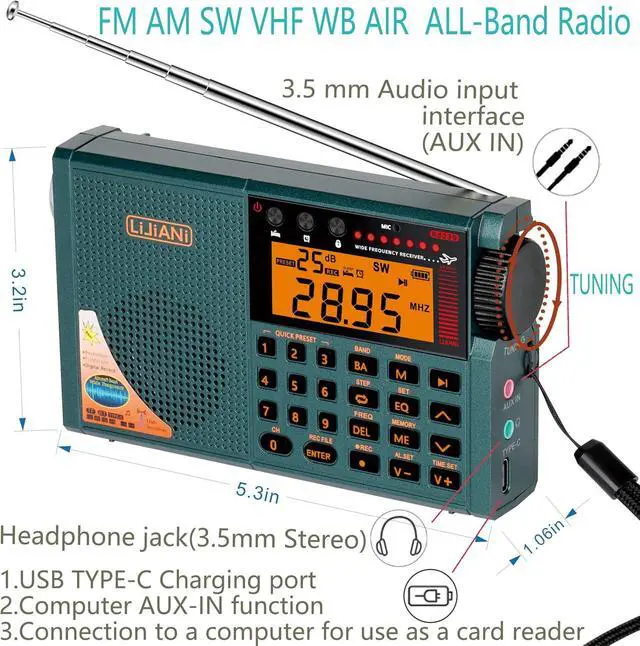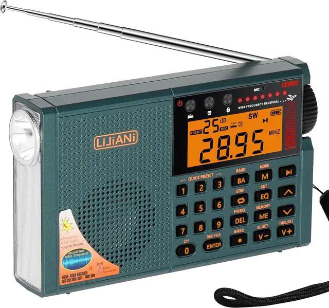 • All world bands: AIR/VHF/AM/FM/Shortwave/Weather bands radio.this is pocket small radio,Best sensitivity for better reception and stable signal, with Digital Record, Alarm Clock, Sleep Timer, Reading Lamp, flashlight,backlit display & backlit buttons