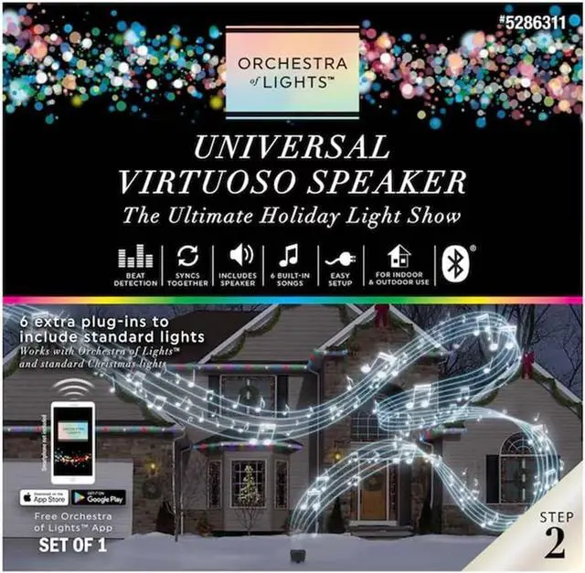Universal Virtuoso Speaker with 6 holiday songs and Bluetooth to sync your own music to the light show, app-controlled. Includes 6 extra plugins to sync your own standard Christmas lights to the light show