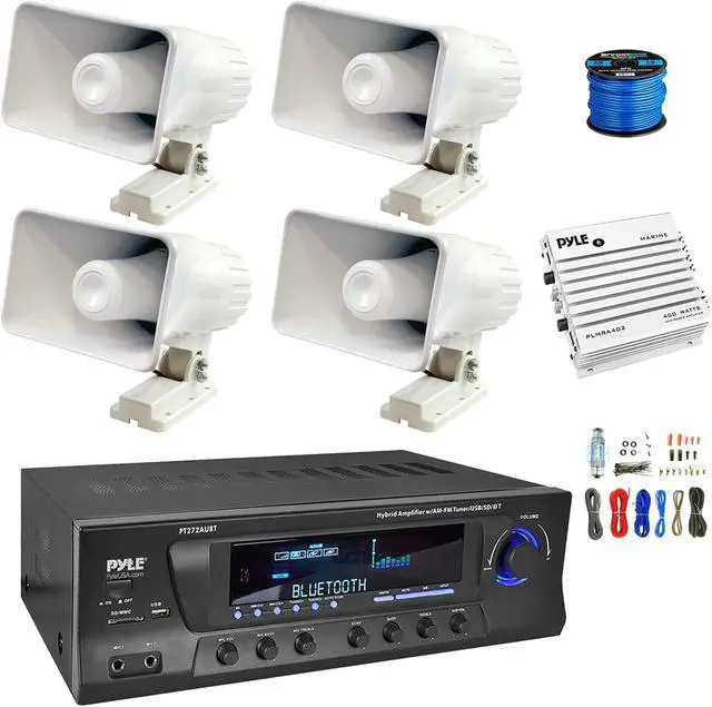 PACKAGE BUNDLE INCLUDES: Enrock Home Theater 4-Channel 300W Bluetooth AM/FM Amplifier Receiver, Amplifier w/Kit, 4x 6" 50 Watt Indoor/Outdoor Portable PA Horn Speakers w/Wire
